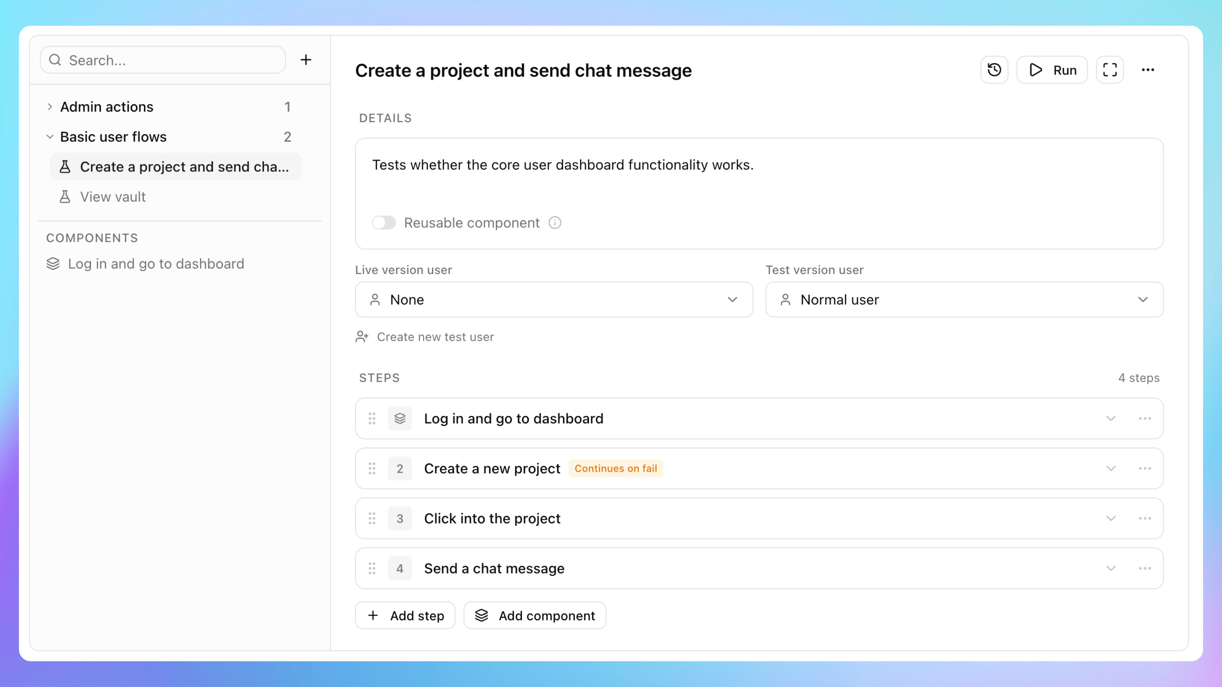 Components are created in the same builder as tests. Once a definition is marked as reusable, you can insert it into other tests as a component step. Components are not run directly, and they cannot be added to groups.