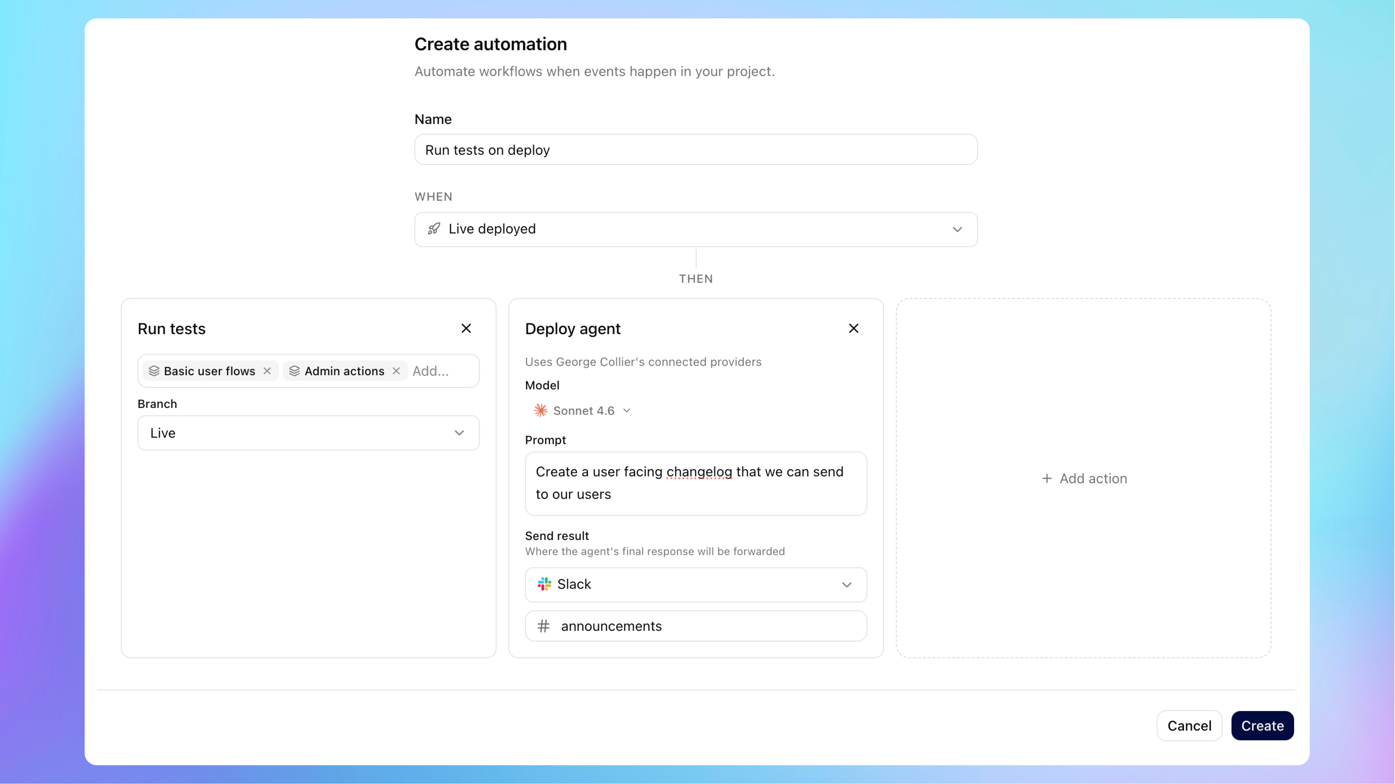 Deploy an agent - kick off an agent with a prompt that includes context from the trigger, like the branch name, then forward the final result by email, webhook, or Slack.