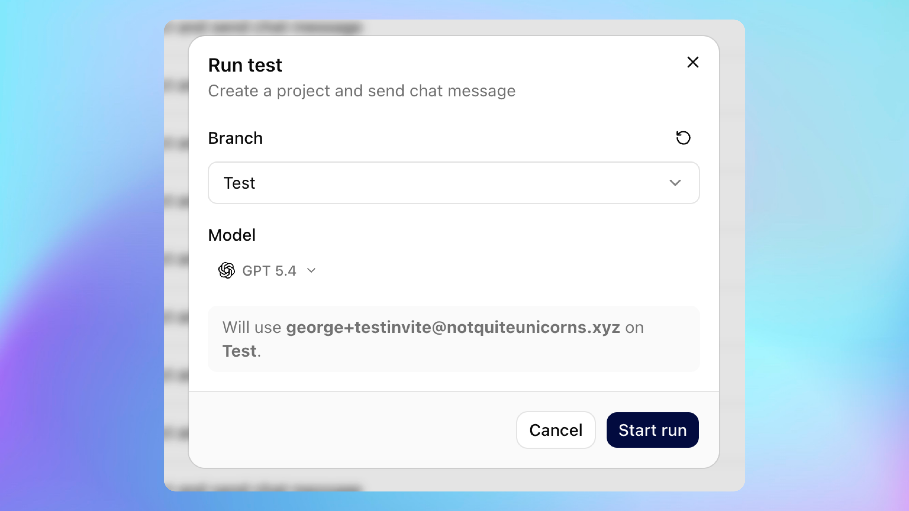 Run a group from the group menu in the sidebar or from the group page. You choose the branch and model once, then Buildprint starts one child run per test in that group.