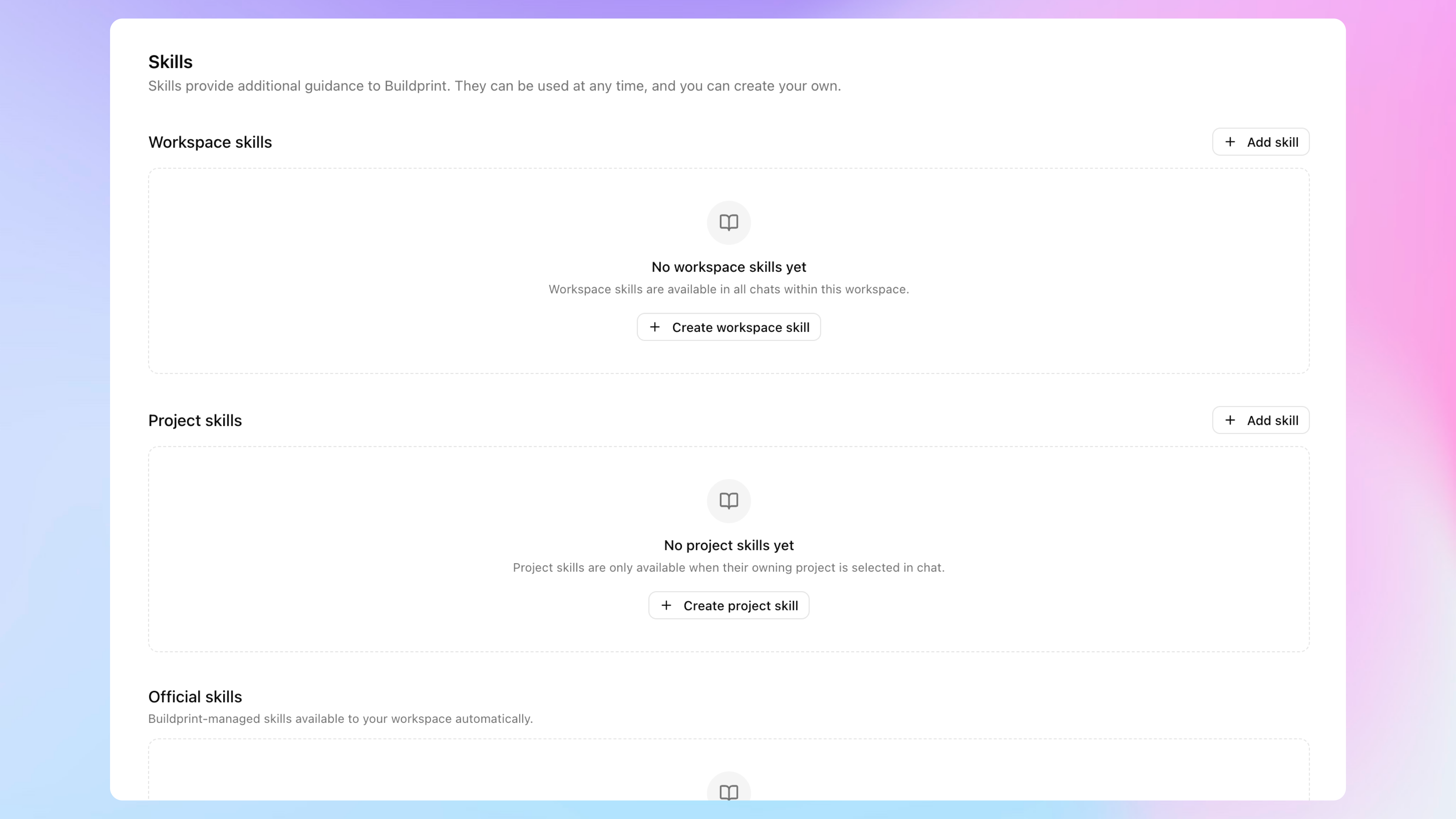 Official skills are Buildprint-managed and automatically available to all projects and workspaces. These cover general behaviours like security, performance optimisation, integrations with common APIs like Stripe or OpenAI.