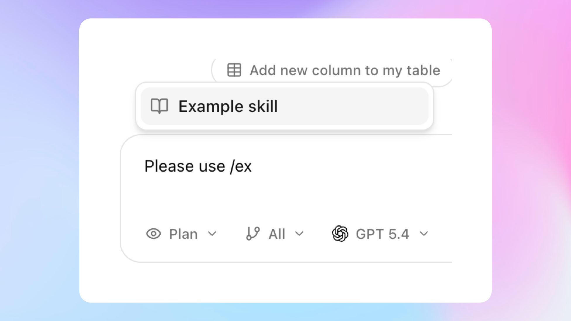 To use a skill, open a project chat. You can add it using the Skills dropdown, or by using a / command. It will automatically be included in your message.