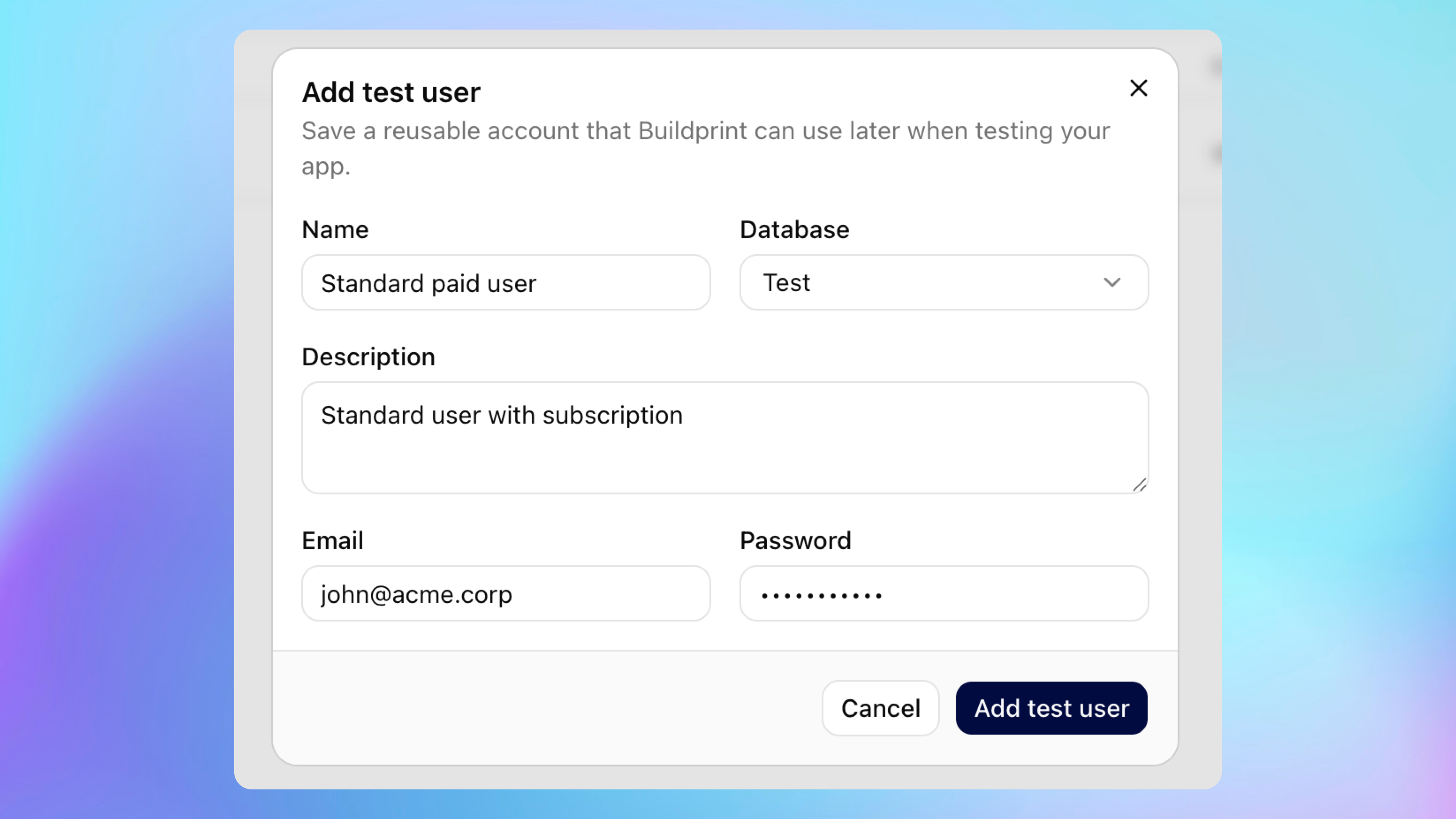 Test users are saved credentials that Buildprint's AI agent uses to log in to your app during testing. Each test user has a name, and optionally an email, password, and description to help the agent understand which account to use for different scenarios.